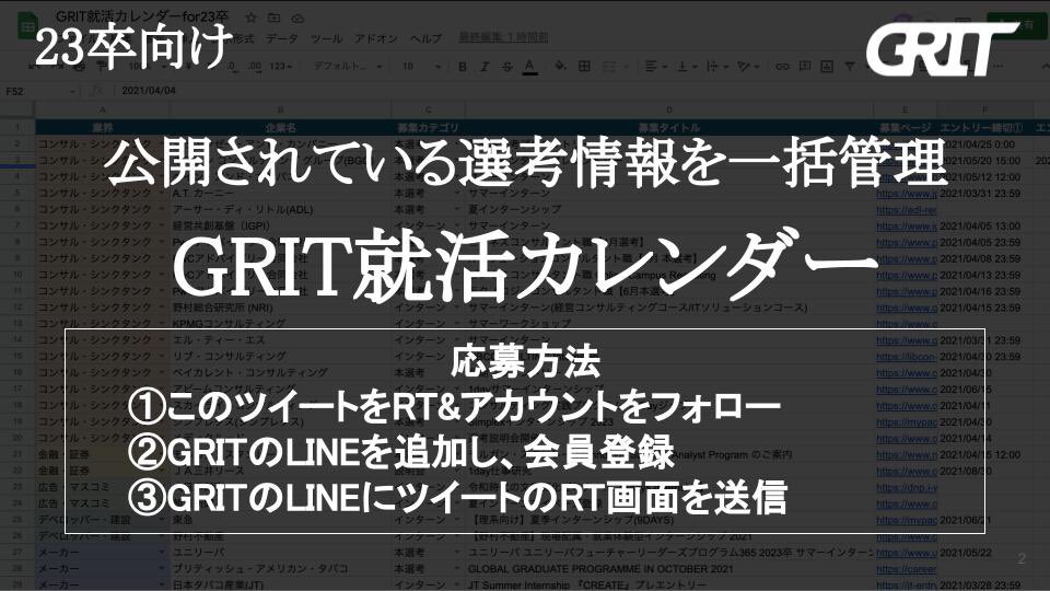 Grit 全員無料配布 現在公開されている全業界の求人を一覧で見れる Grit就活カレンダーfor23卒 を配布いたします 広告によって表示順の変わらないフラットな選考情報を 毎週求人サイトや企業hpからデータから更新し スプレッドシートに共有いたし